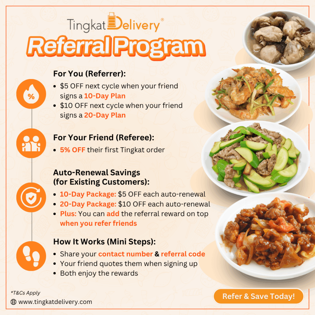 Join our Tingkat Loyalty Program to enjoy standing order for 10 consecutive times with additional savings! Applicable for 10 days or 20 days Regular Tingkat packages only.